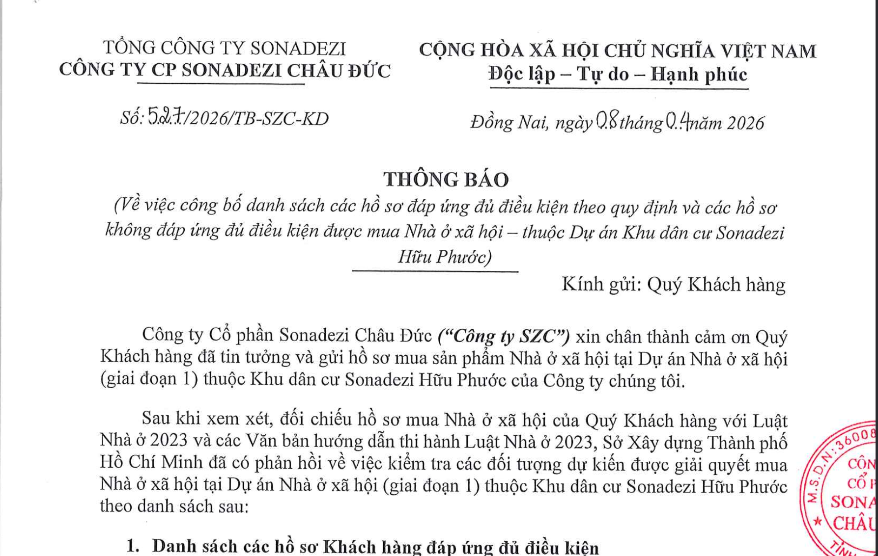Về việc công bố danh sách các hồ sơ đáp ứng đủ điều kiện theo quy định và các hồ sơ không đáp ứng đủ điều kiện được mua Nhà ở xã hội - thuộc Dự án Khu dân cư Sonadezi Hữu Phước